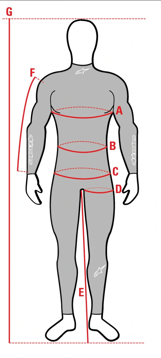 | A. Chest (cm) | 78 - 82 | 82 - 86 | 86 - 90 | 90 - 94 | 94 - 98 | 98 - 102 | 102 - 106 | 106 - 110 | 110 - 114 | 114 - 118 | 118 - 122 | 122 - 126 | 126 - 130 |