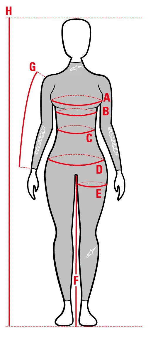 | F. Inner Legs (cm) | 72 - 74.5 | 74.5 - 77 | 77 - 80 | 80 - 82 | 82 - 83.5 | 83.5 - 84.5 | 84.5 - 86 | 86 - 87 |